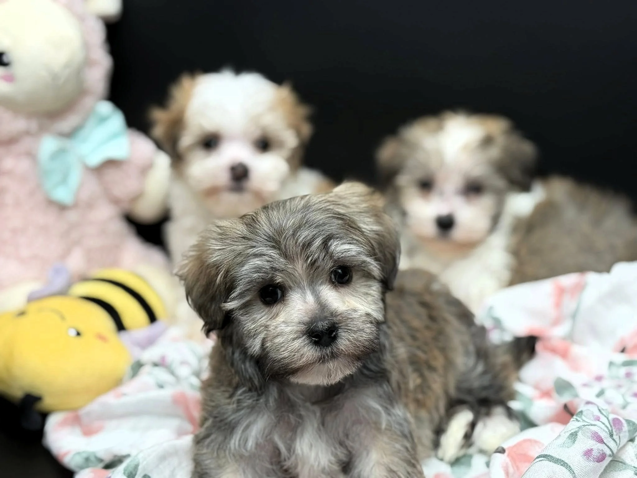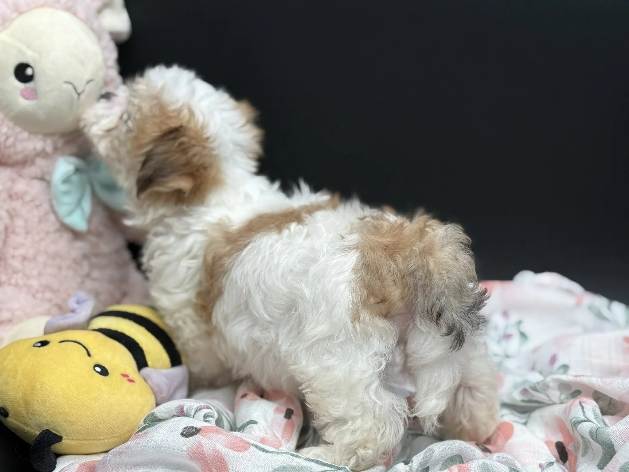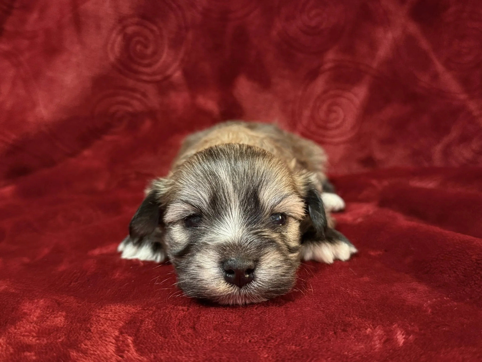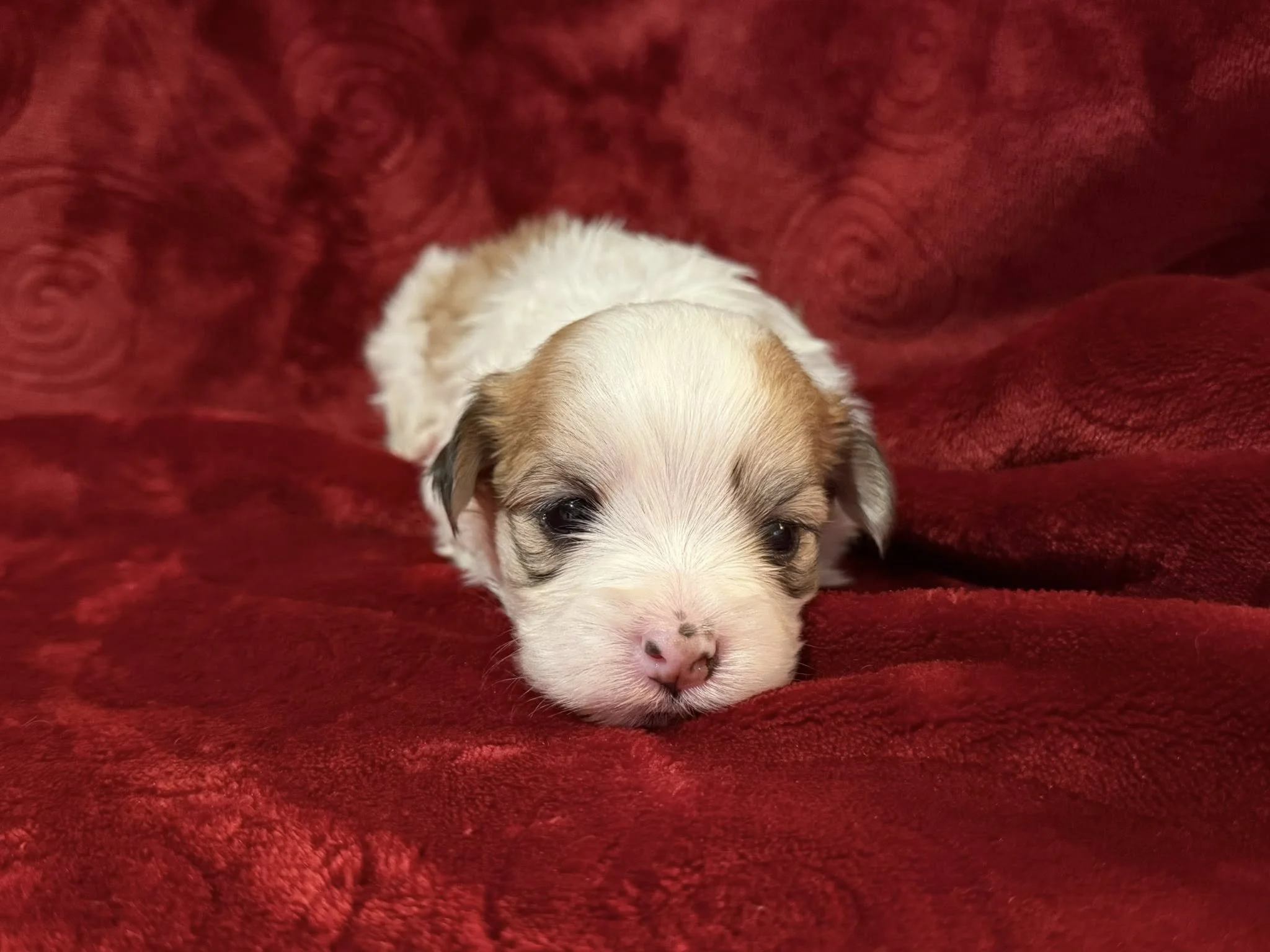 Austin is charting 7-8lbs. This sweetie pie has heterochromia(one blue eye and one dark brown eye). Heterochromia is super rare in Havanese. He was born with it and has no health issues. Austin is the calmest of his siblings but he is always down for playtime.