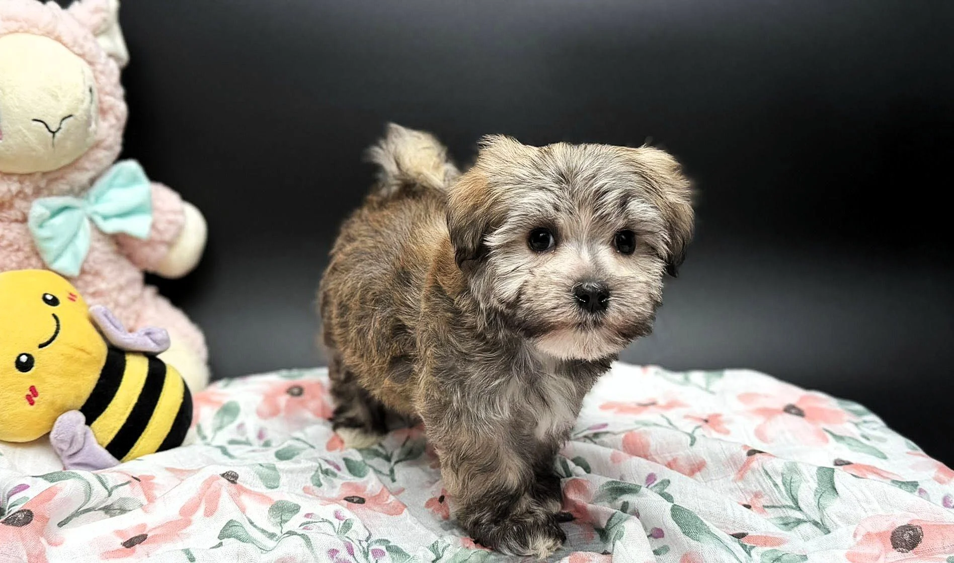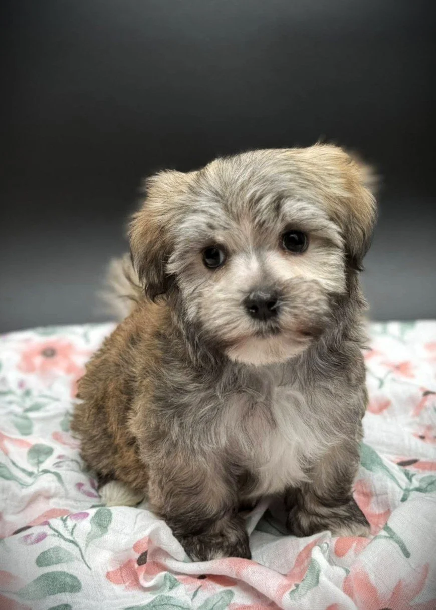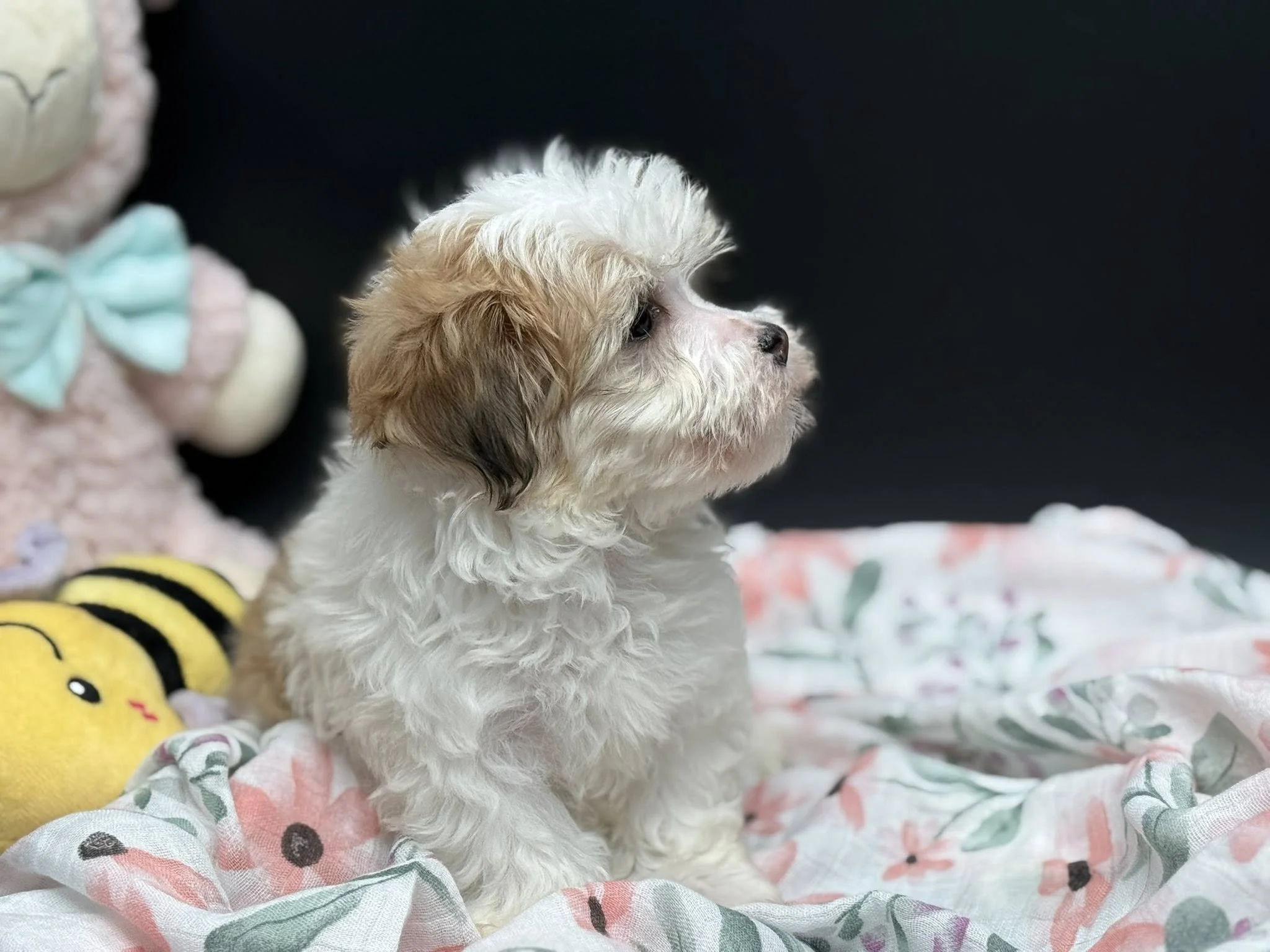 Austin is charting 7-8lbs. This sweetie pie has heterochromia(one blue eye and one dark brown eye). Heterochromia is super rare in Havanese. He was born with it and has no health issues. Austin is the calmest of his siblings but he is always down for playtime.
